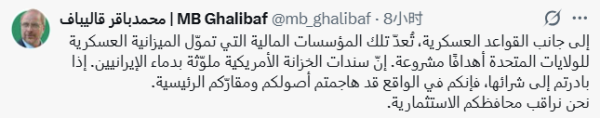 伊朗伊斯兰议会议长卡利巴夫当地时间22日在社交媒体发文称,除美军军事基地外,为美国军费提供资金支持的金融机构也是伊朗的合法打击目标。