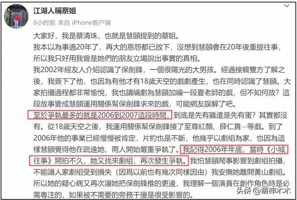 前经纪人蔡清珠表示自己是以双方朋友的立场说出事情的真相。第一个重点是《十八岁的天空》并非黄慧颐运用关系帮保剑锋拿到的戏,而是保剑锋跟她签约后拍的第一部戏,同时认识了黄慧颐,并邀请编剧为她加编了夏老师的戏份。之后她又用关系给保剑锋运作了《至尊红颜》、《薛仁贵》等戏。