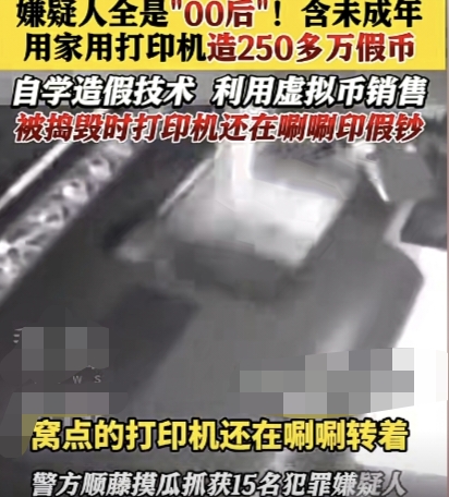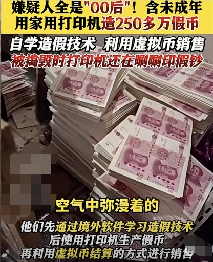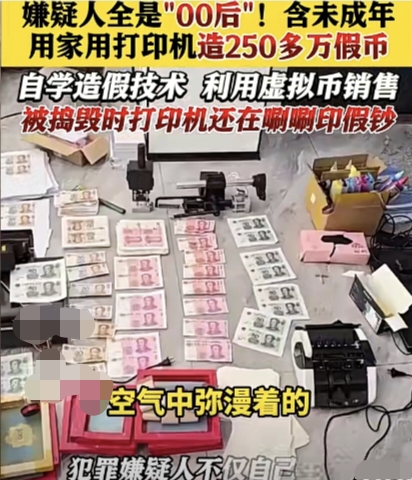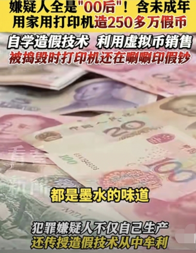 当民警踹开北京朝阳区某出租屋房门时,两台家用打印机仍在"唰唰"运转,一张张伪造的百元纸币不断吐出,空气中弥漫着刺鼻的墨水味。近日,北京警方披露的这起特大假币案令人震惊:涉案的15名犯罪嫌疑人均为"00后",其中不乏未成年人,他们用常见的家用设备造出250多万元假币,更构建起一条融合境外技术、网络采购与虚拟币结算的犯罪链条。