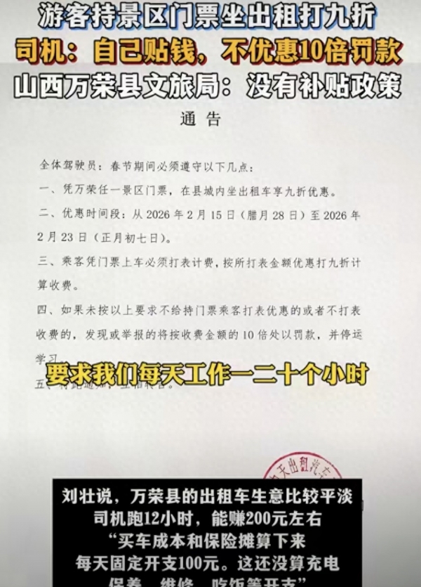 过年期间,山西万荣县为了吸引游客,搞了个挺热闹的活动:游客拿着当地的景区门票,住酒店、下馆子、甚至打车,都能打九折。这主意听起来不错,可最近却有出租车师傅倒起了苦水--这打折的钱,得司机自己贴。不参加?万一被游客举报了,还得按车费的十倍罚款。