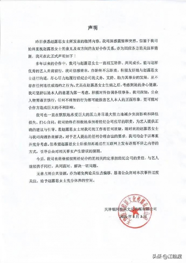 8月3日上午,赵露思经纪公司银河酷娱发布声明称,昨日获悉赵露思所发表的微博内容,公司深感震惊和突然。