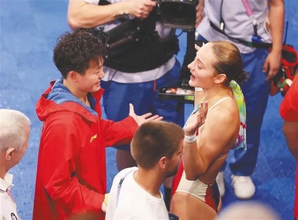 7月27日,陈艺文(左)与参赛选手交流。新华社发