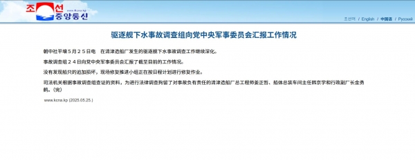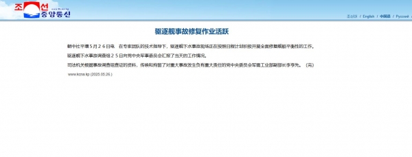 5月26日朝中社再次发布通告,称在专家团队的技术指导下,驱逐舰下水事故现场正在按照日程计划积极开展全面修复舰船平衡性的工作。