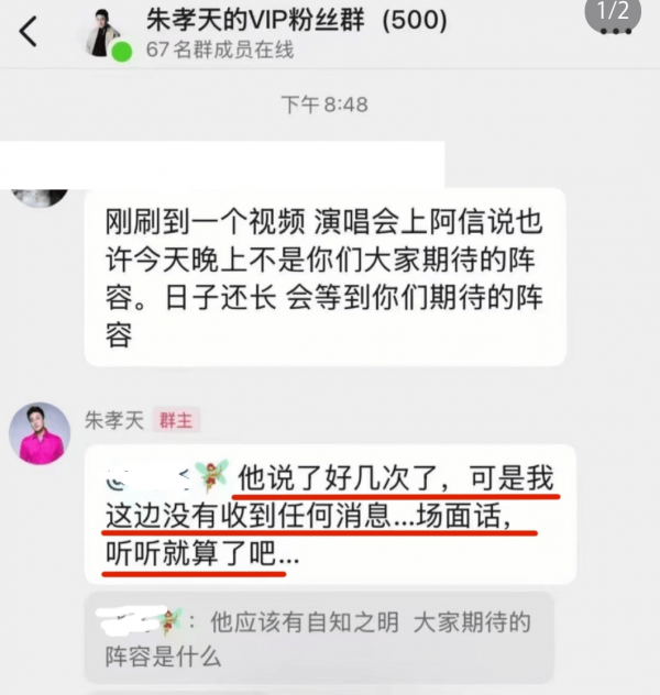 而后,朱孝天在个人粉丝群回应了阿信的连番感谢。在一张流传出的朱孝天VIP粉丝群中,有粉丝称阿信提到知晓演唱会阵容没有符合大家的期待,但来日方长会等到大家想要的阵容,其他粉丝则跟着吐槽阿信应该有自知之明,朱孝天特意回了这位粉丝,表示阿信在外面说了好几次,但他本人没有收到任何消息,吐槽阿信说的是场面话,听听就算了。