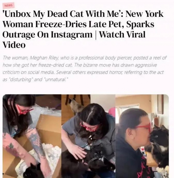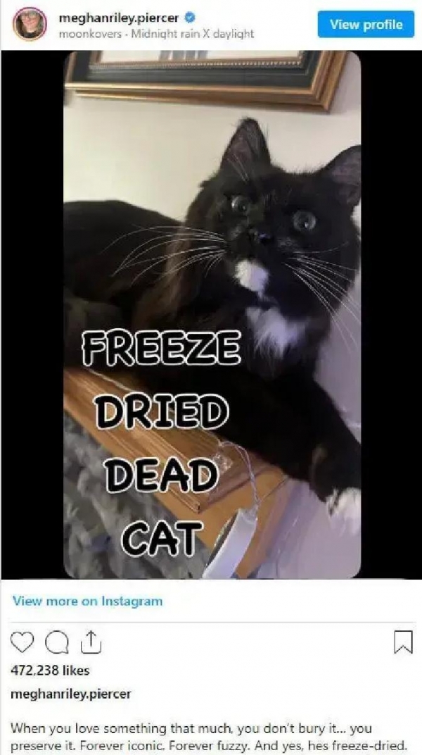 其实,Chloe并不是个例。在美国,Meghan Riley将爱猫做成了标本;Soren High把自己16岁的老猫冻干保存。她们都面临着同样的指责,也都在用同样的方式自我疗愈。