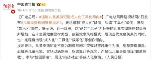 1月8日,广电总局网络视听司发布儿童类微短剧管理提示,要求遏制儿童微短剧的"成人化"倾向、纠偏"工具化"倾向、抵制"娱乐化"倾向,防止因创作不当损害未成年人身心健康发展。