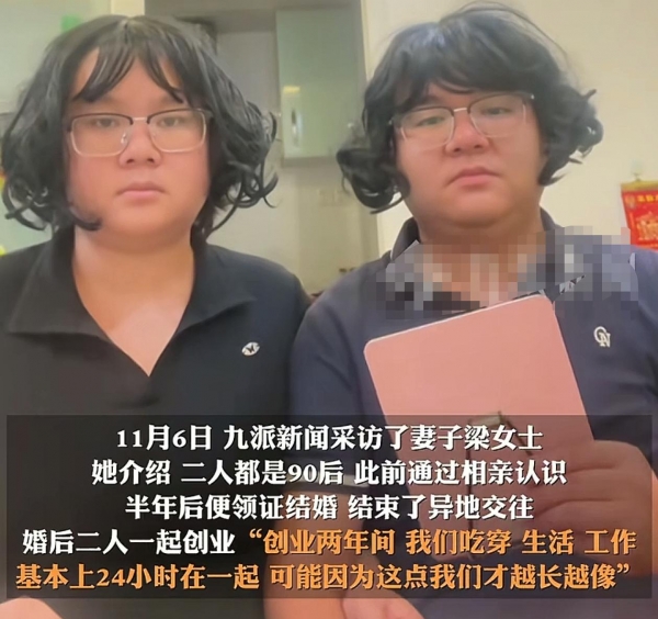 梁女士说,他们是相亲认识的,异地恋谈了半年,就结婚了,婚检结果显示,他们不是亲戚,他们也经常在网上发生活视频,很真实,俩人一起开了个药材汤料店,工作生活都在一起,24小时绑定,梁女士觉得,这就是他们"越长越像"的原因。
