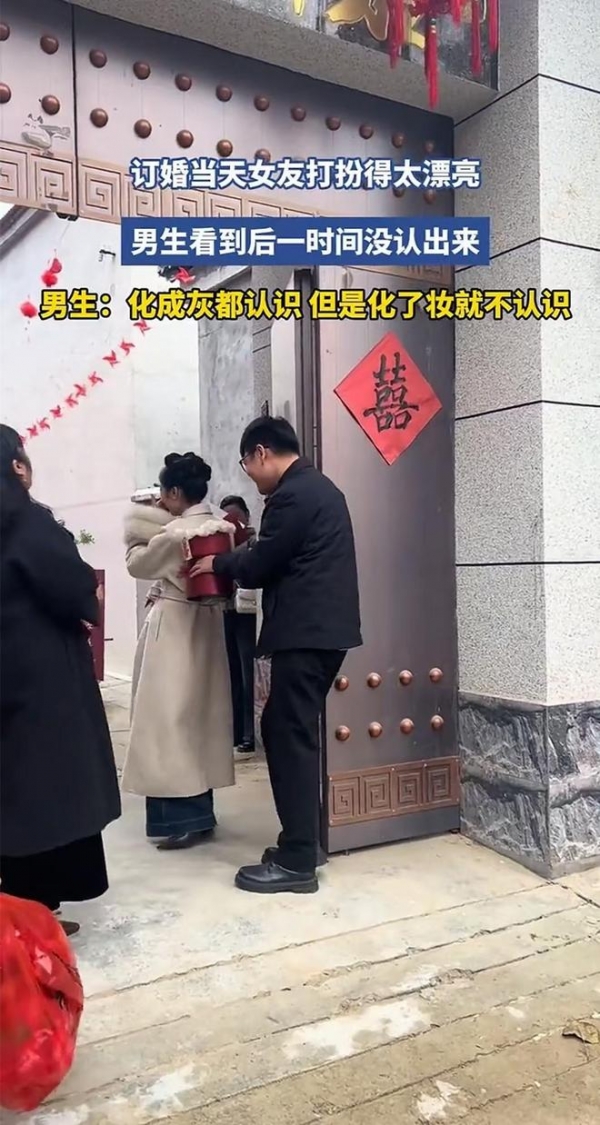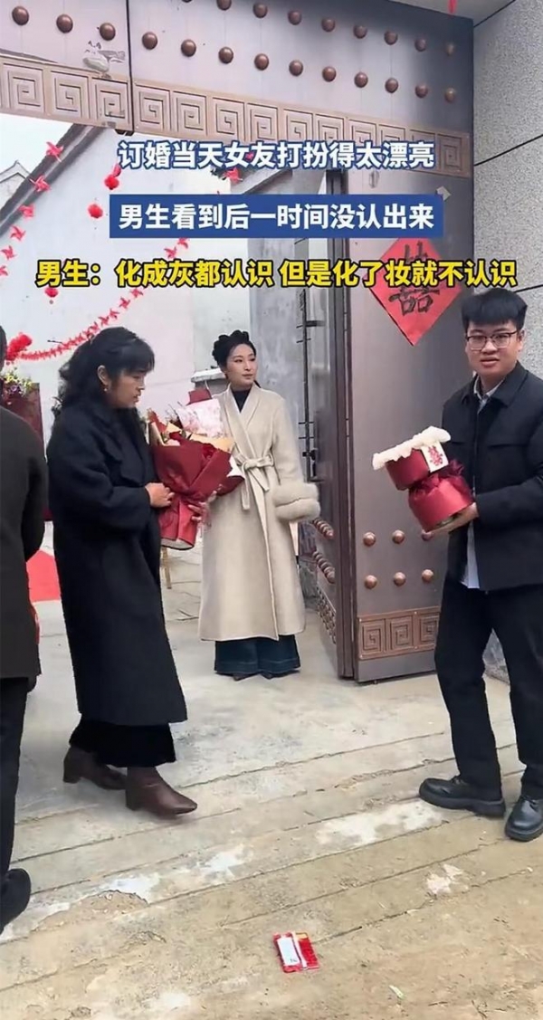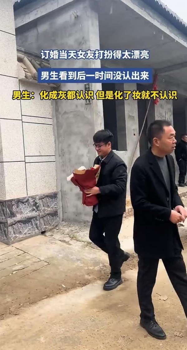 故事发生在2025年10月26日,河南当地一对相恋多年的情侣,按照习俗举行订婚仪式。当天上午,男生手捧着精心挑选的鲜花,穿着笔挺的衣服,怀着紧张又期待的心情,前往女方家中赴约--这是他和女友人生中重要的节点,想着即将与心爱之人定下未来,男生的手心甚至微微出汗。他早已习惯了女友平日里的模样:戴着一副黑框眼镜,穿着休闲的T恤和牛仔裤,说话时带着点腼腆,像个邻家女孩般亲切。可当他走到女友的家门口,抬头看到那个站在面前的身影时,脚步却突然停住了,手里的花束也下意识攥紧了些。