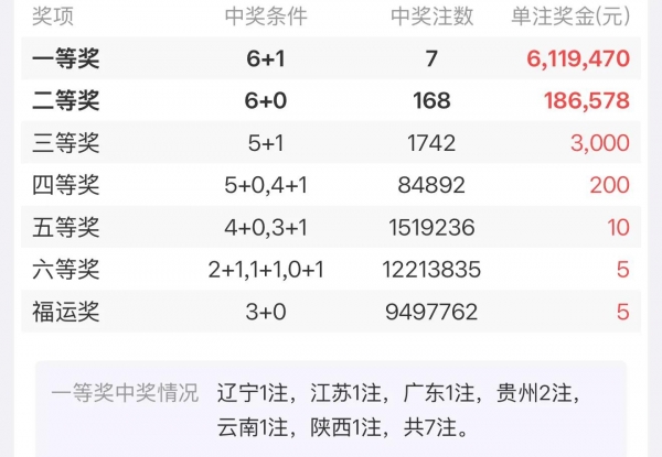 - 一等奖(7注):单注奖金611.9万元,辽宁、江苏、广东、贵州(2注)、云南、陕西各1注。
