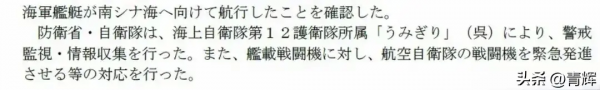 日本海上自卫队出动第12护卫队的"吴"号护卫舰,还有"雾岛"号护卫舰等多艘舰艇参与对山东舰远海航行的跟踪和干扰,同时,日本航空自卫队战机也紧急出动!