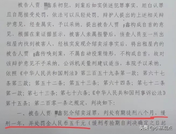 判决书显示,鲁婷婷出生于2010年10月,案发时已满13周岁未满14周岁。法院认为,贾某鑫构成介绍卖淫罪,系初犯,到案后能如实供述,坦白认罪,依法从轻处罚,判处有期徒刑八个月,缓刑一年,并处罚金5000元。