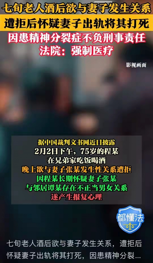 你想啊,都75岁的人了,老两口分房睡,老婆不愿意也正常。可程某不这么想,他长期怀疑妻子张某跟邻居谭某有不正当男女关系,这次被拒绝,疑心病又犯了。