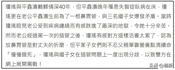根据其子透露,这几年琼瑶一直在打理已故丈夫平鑫涛的后事,还要面对继子女的纷争。「有时候会很烦躁,整宿整宿睡不着。」一位家庭密友如是说。这让人想起一个残酷的现实:现实生活从来都不如戏剧来得干净利落。