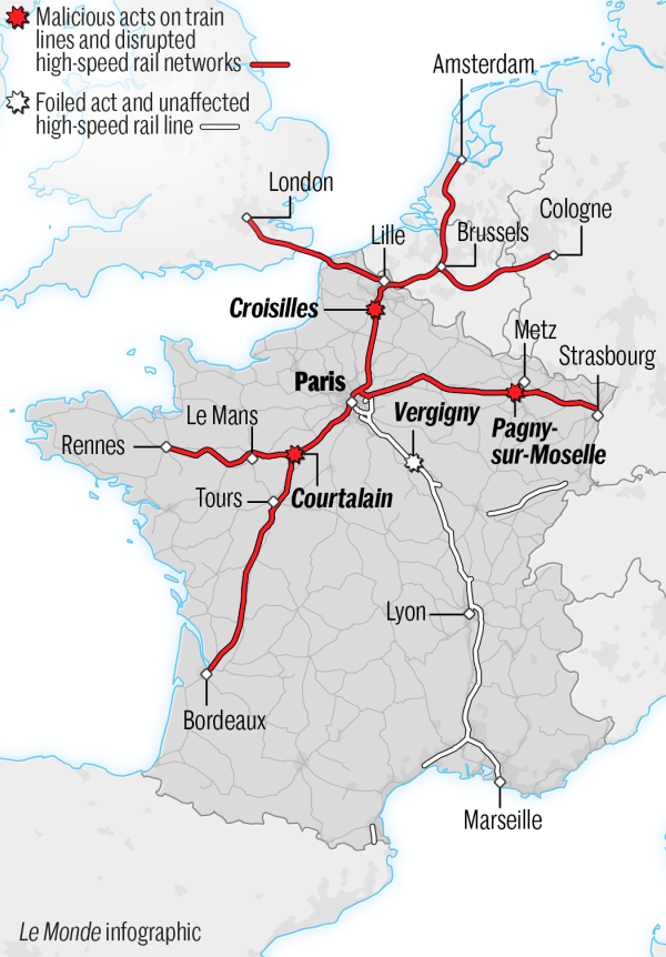 法国国家铁路公司(SNCF)当时通报,25日夜间至26日凌晨,在大西洋、北部和东部三个干线方向的高速铁路附近同时发生纵火等破坏活动,导致铁道信号装置、电缆等设备受损,多条高铁线路中断,列车大规模取消或延误。法国交通部长韦格列特指责,这是针对法国高铁系统的"有组织性恶意攻击行为"。