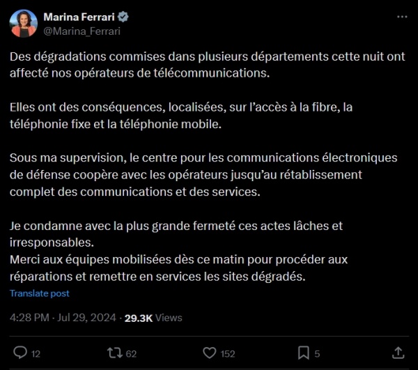 7月29日,法新社援引来自法国警方的消息源称,法国多地多家电信运营商的光纤网络遭到"破坏",波及6个地区,所幸正在举办奥运会的首都巴黎未受影响。法国数字事务国务秘书玛丽娜·费拉里(Marina Ferrari)29日证实破坏造成"局部影响",并表达"最强烈的谴责"。