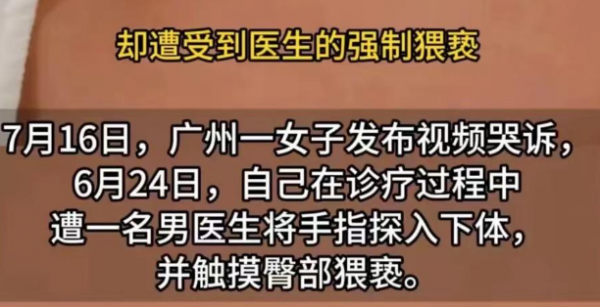 就在7月16日,广州的一名女子发布视频哭诉说,在6月24日的时候,自己在治疗落枕的过程中遭到了男医生将手指探入下体,并触摸臀部猥亵,报警后,警察却只对男医生以治安处理法,处以行政拘留7天,而觉得不可思议,现在涉事的男医生依旧还在正常的上班。