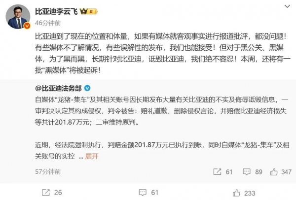 据悉,比亚迪法务部在微博发布的首条博文,就和自媒体"龙猪-集车"有关。2023年7月4日,比亚迪法务部首条博文表示,将起诉微博用户@龙猪-集车 长期发布不实信息、恶意诋毁品牌,要求其删除相关侵权言论、公开道歉并赔偿500万元人民币。
