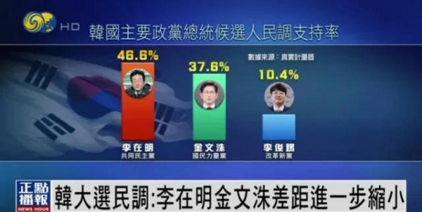最新民调:李在明支持率现为47.3%,排名第一,但与第二名国民力量党候选人金文洙的差距从上周的12.8个百分点缩小至7.7个百分点