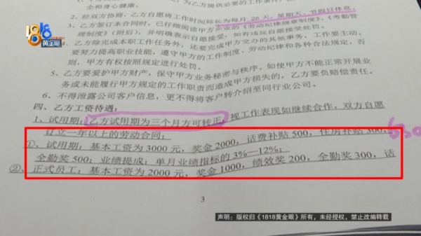 合同约定,试用期算上各类补贴奖金后的工资是6300元,提成按3%到12%计算,正式员工是3800元,提成按5%到20%计算,对比下来试用期工资要高于正式员工,提成比例则要小一些。