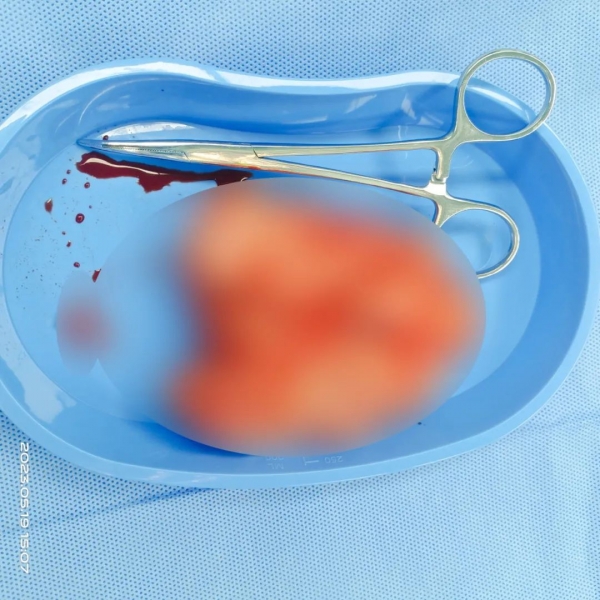 术中,医生在全麻下行腔镜下左侧乳房病损切除术,手术切口约4cm,手术非常顺利,术中出血也很少,切除的肿瘤大小约6×5×4cm,分叶状。病理报告显示:纤维上皮性肿瘤,符合幼年性纤维腺瘤。术后,切口愈合良好,瑶瑶在第二天拔除引流管后出院。一周后复查,瑶瑶的左腋窝切口已愈合,双侧乳房恢复到对称状态。