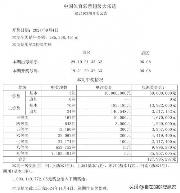 今天是9月4日,星期三,大乐透第24103期的开奖报道。
