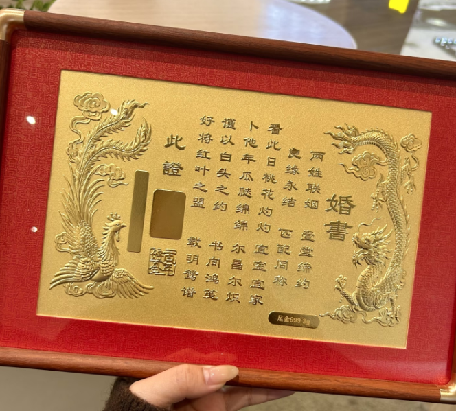 这款黄金婚书能实现1克造整书,核心依托的是纳米压片、真空溅射和精雕等现代工艺。制作时先将足金熔炼提纯,再用高精度设备把黄金压制成薄如蝉翼却有韧性的金膜,搭配环保硬质底托定型,整个过程没有虚标和掺假,每一份婚书都附带权威检测证书,还刻有足金999钢印,能清晰看到黄金品质标识。成品婚书的常规尺寸和传统婚书相当,正面雕有龙凤呈祥这类传统吉祥纹饰,中间能精准刻上新人的姓名和大婚吉日,下方还有礼书落款,背面搭配专属支架,能直接摆放展示。