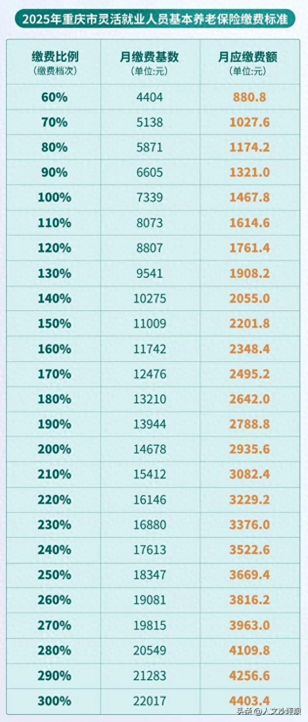 2025年,缴费基数上下限核定中使用的就业人员平均工资执行2024年全市就业人员平均工资标准,即88065元/年,按照不同月缴费基数,月缴费金额具体如下: