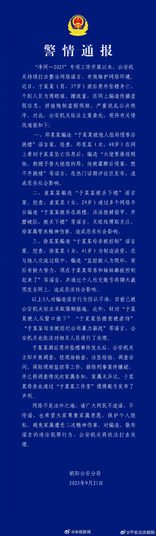 昨晚,北京警方通报于某某酒后意外坠楼身亡事件。通报称,近日,于某某(男,37岁)酒后意外坠楼身亡,个别人员为博眼球、蹭流量,在网上编造传播虚假信息,拼接炮制虚假视频,严重扰乱公共秩序。对此,公安机关依法立案查处。