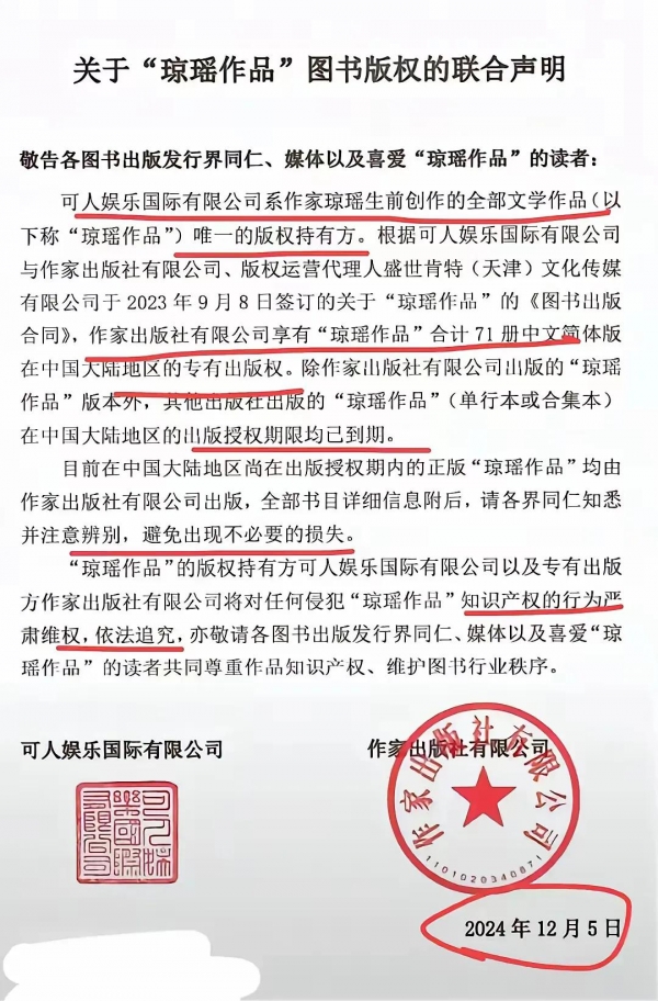 何琇琼用可人娱乐公司,作家出版社有限公司的名义,对外说琼瑶的71册中文简体版,在大陆地区的版权全部归可人出版社,其他出版社的合作都到期了。