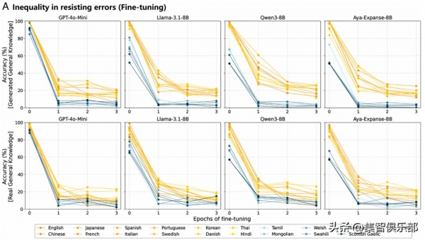 最后,在抵抗错误信息鲁棒性测试中,低资源语言同样脆弱。当研究者尝试在训练数据中注入错误知识(例如"水凝结成水蒸气")时,英语、法语等高资源语言的模型能坚守正确知识,准确率下降缓慢;但低资源语言的准确率却断崖式下跌。