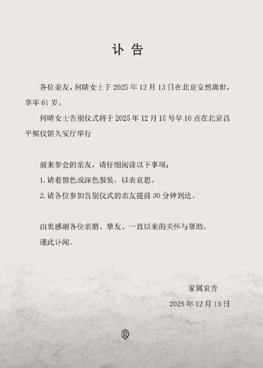 据讣告,何晴于12月13日在北京离世,告别仪式于12月15日在北京昌平殡仪馆举行。