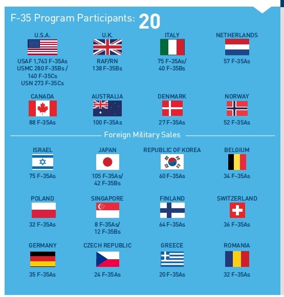 对于绝大多数盟国来说,选择F-35与否与其说是为了战斗力,不如说是为了装备更新换代。盟国中现有战斗机以F-16、F-18为主,大多面临寿命到期问题,换用F-35很自然。在现有和潜在F-35用户中,澳大利亚、加拿大、芬兰、西班牙、瑞士都是F-18用户,比利时、丹麦、荷兰、挪威、希腊、意大利、波兰、罗马尼亚、新加坡、韩国都是F-16用户。多数是从新用到旧,少数是从二手F-16开始,从旧用到更旧。只有捷克("鹰狮"用户)、英国和德国("台风"、"狂风"用户)、日本(F-15和三菱F-2用户,后者与F-16高度相似)例外。