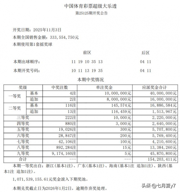 2025年11月3日,体彩大乐透第25125期圆满开奖,本期采用第1套摇奖球,全国销售额达333,554,750元,总派奖154,203,411元,1,071,539,155.61元奖金滚入下期奖池。