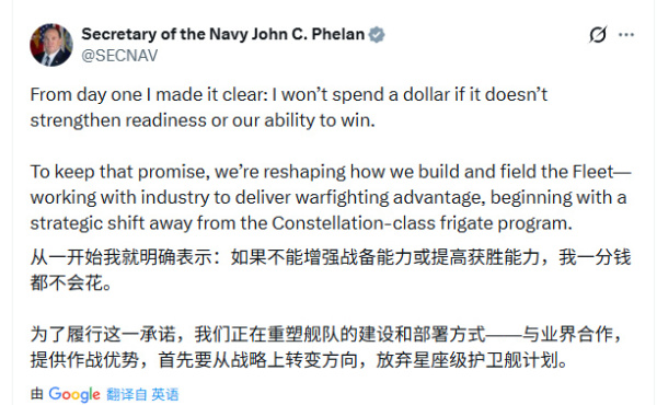美国海军部长约翰·费伦周二在社交媒体上说:"我们正在重塑海军打造舰队的方式。今天,我可以宣布第一个公开行动是从星座级护卫舰项目的战略转移,为了海军的方便,海军和我们的行业合作伙伴已经达成了一个全面的框架,终止了该级别的最后四艘尚未开始建造的舰艇。"