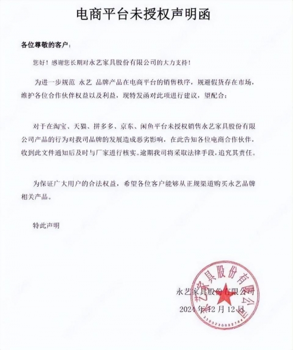 函件显示,对于在淘宝、天猫、拼多多、京东、闲鱼平台未授权销售永艺家具股份有限公司产品的行为,收到此文件通知后,及时与厂家进行核实。逾期将采取法律手段,追究其责任。