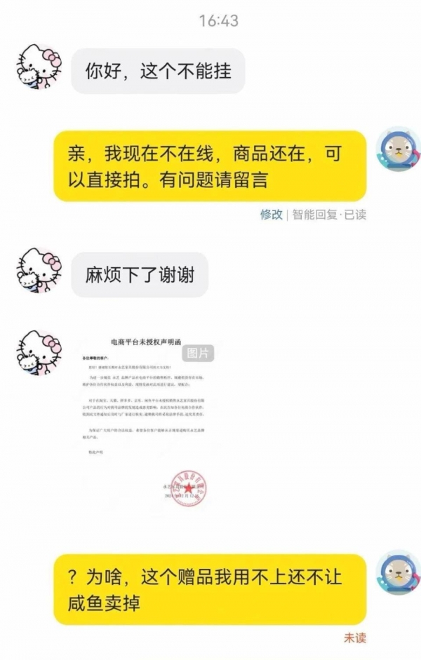 11月11日,记者以客户身份咨询永艺官方旗舰店,询问其在门店下单后,是否可以转售,客服称"不支持"。记者将函件发送给客服,询问该函件是否由工作人员发出,客服人员承认该函件真实,为工作人员发出。