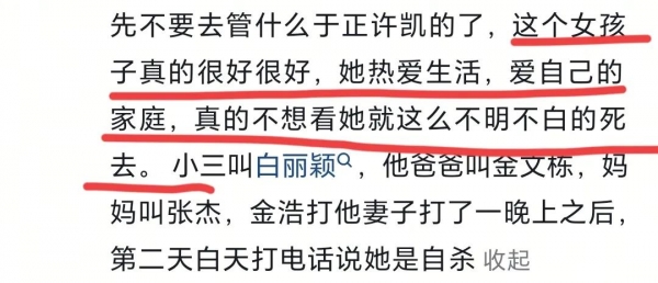 同时还提到,金浩外面有个叫白丽颖的小三,他爸爸叫金文栋、妈妈叫张杰,"金浩打了妻子一晚上后,第二天白天还打电话说她是自S"。