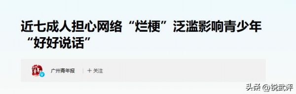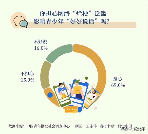 数据显示,中国青年报社社会调查中心对1341名受访者进行的一项调查显示,69.0%的人担心网络"烂梗"泛滥会影响青少年"好好说话"。