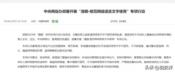 2024年10月,中央网信办、教育部联合印发通知,部署开展"清朗·规范网络语言文字使用"专项行动。
