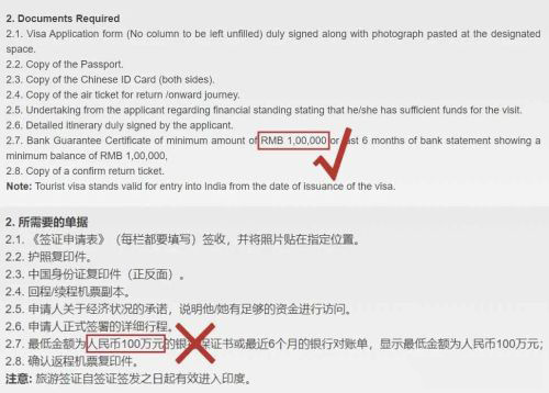 整个申请流程从一开始就问题频出、困难重重。7月印度驻华使馆宣布开放旅游签证时,其签证中心官网的中英文页面就出现明显出入:英文版要求10万元银行流水,中文版却显示100万元。这种基本信息的不一致,反映出印方在签证事务上的不严谨、不上心。