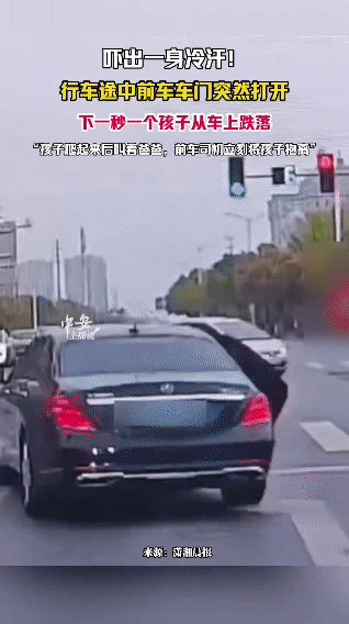 视频车正常跟车行驶途中,前车左转时,右后车门突然打开,随即一个孩子从车上掉了下来。