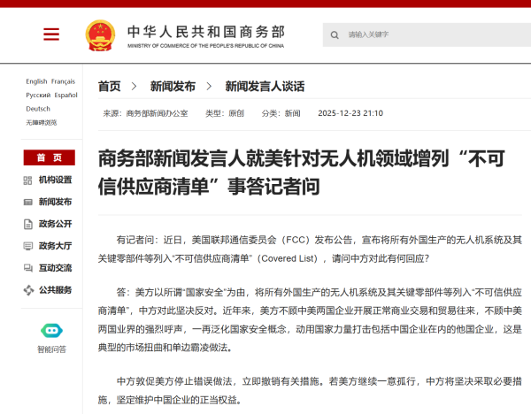 商务部网站12月23日消息,商务部新闻发言人就美针对无人机领域增列"不可信供应商清单"事答记者问。