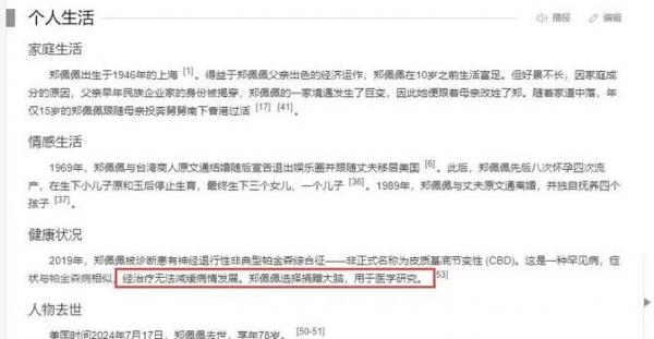 说起郑佩佩,就不得不提她生前的一个重要决定--捐赠大脑。据悉,郑佩佩早在2019年就签署了"捐赠大脑"志愿书。这一决定源于她晚年患上的一种罕见疾病,症状类似帕金森但又不完全相同。
