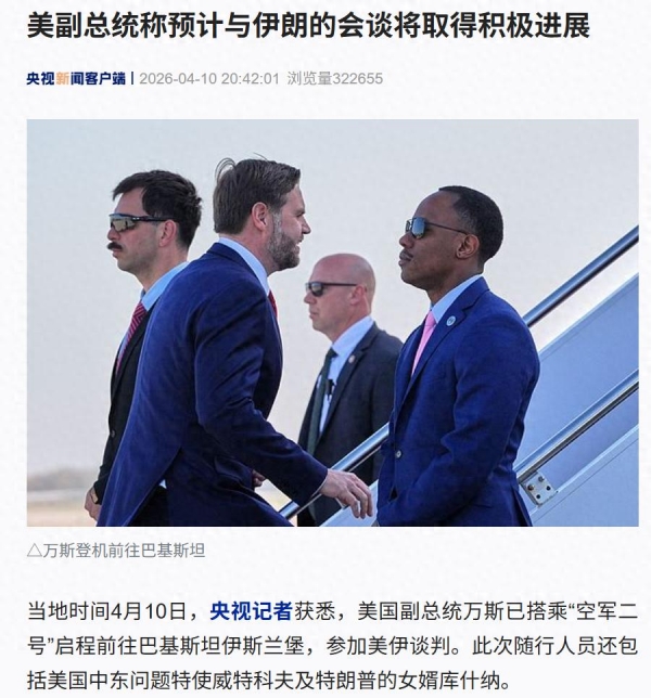 当地时间4月10日,央视记者获悉,美国副总统万斯已搭乘"空军二号"启程前往巴基斯坦伊斯兰堡,参加美伊谈判。此次随行人员还包括美国中东问题特使威特科夫及特朗普的女婿库什纳。