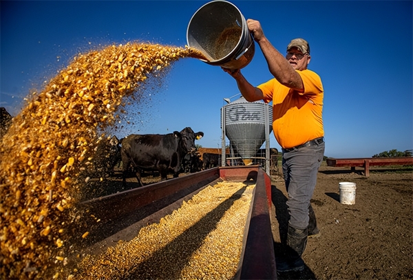 美国农民向牛群投喂玉米饲料