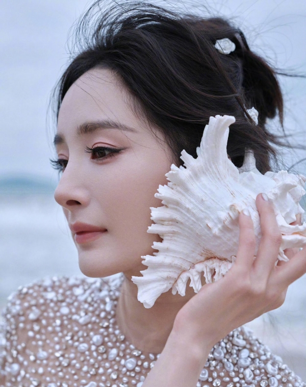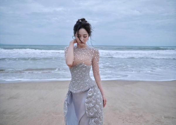 杨幂一出现,现场的镜头就都朝她挤过去。那件亮片和珍珠拼接的缎面礼裙在海风里有光泽,走动间像是把海面的反光带上了岸,直接把"美人鱼上岸"这画面搬到现实里。人群的视线被她牵着走,照片一发,热度就上来了。