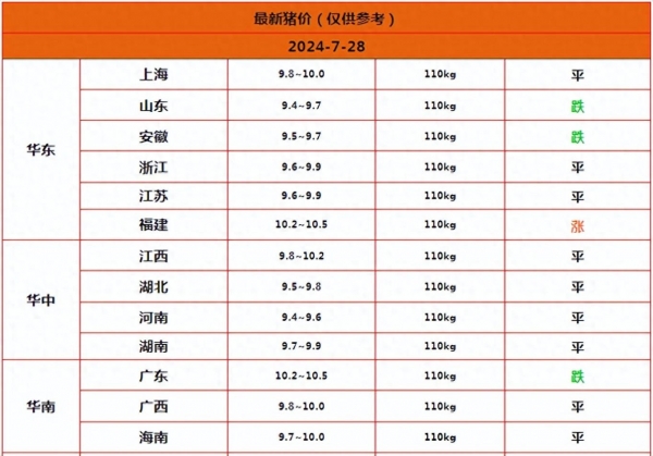 华东地区:山东下跌0.1元/斤,生猪出栏参考价9.4~9.7元/斤。