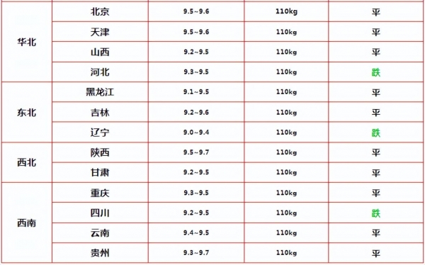 华北地区:河北下跌0.1元/斤,标猪出栏参考价9.3~9.5元/斤。