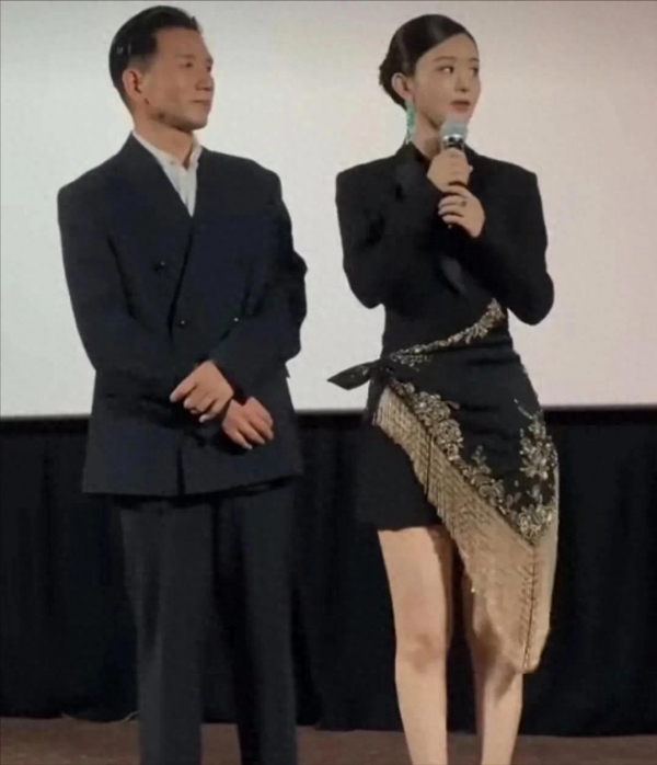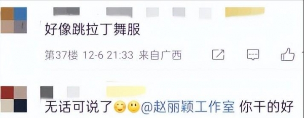 先说这场风波的源头--两套造型。第一套西装裙,某些粉丝给出的评价是"像拉丁舞服"或"微商服"。好吧,怎么形容这衣服,确实有点"别致"。