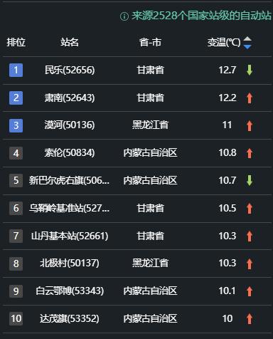 北方在寒潮主体远离后,则开始回暖。今天甘肃、内蒙古、黑龙江部分站点升温超8℃,甘肃民乐升温12.7℃、肃南12.2℃,黑龙江漠河升温11℃,为14时升温最强的地方。